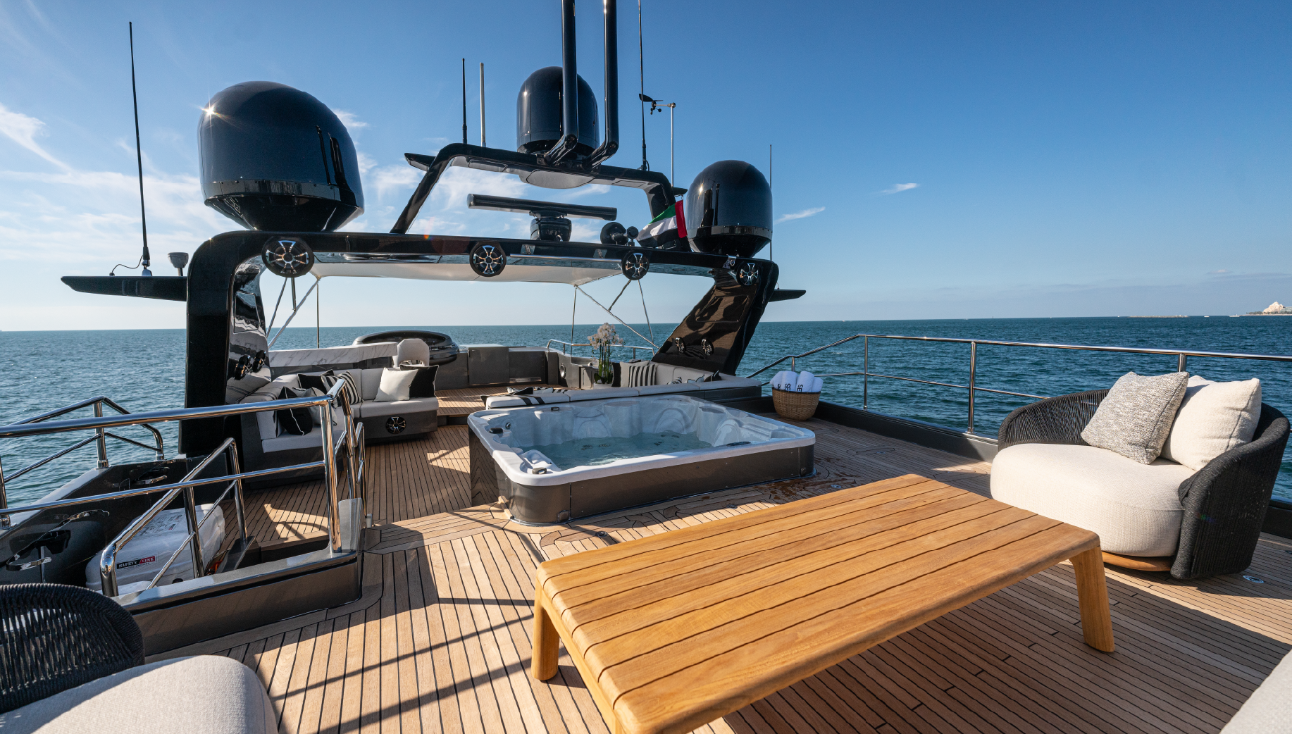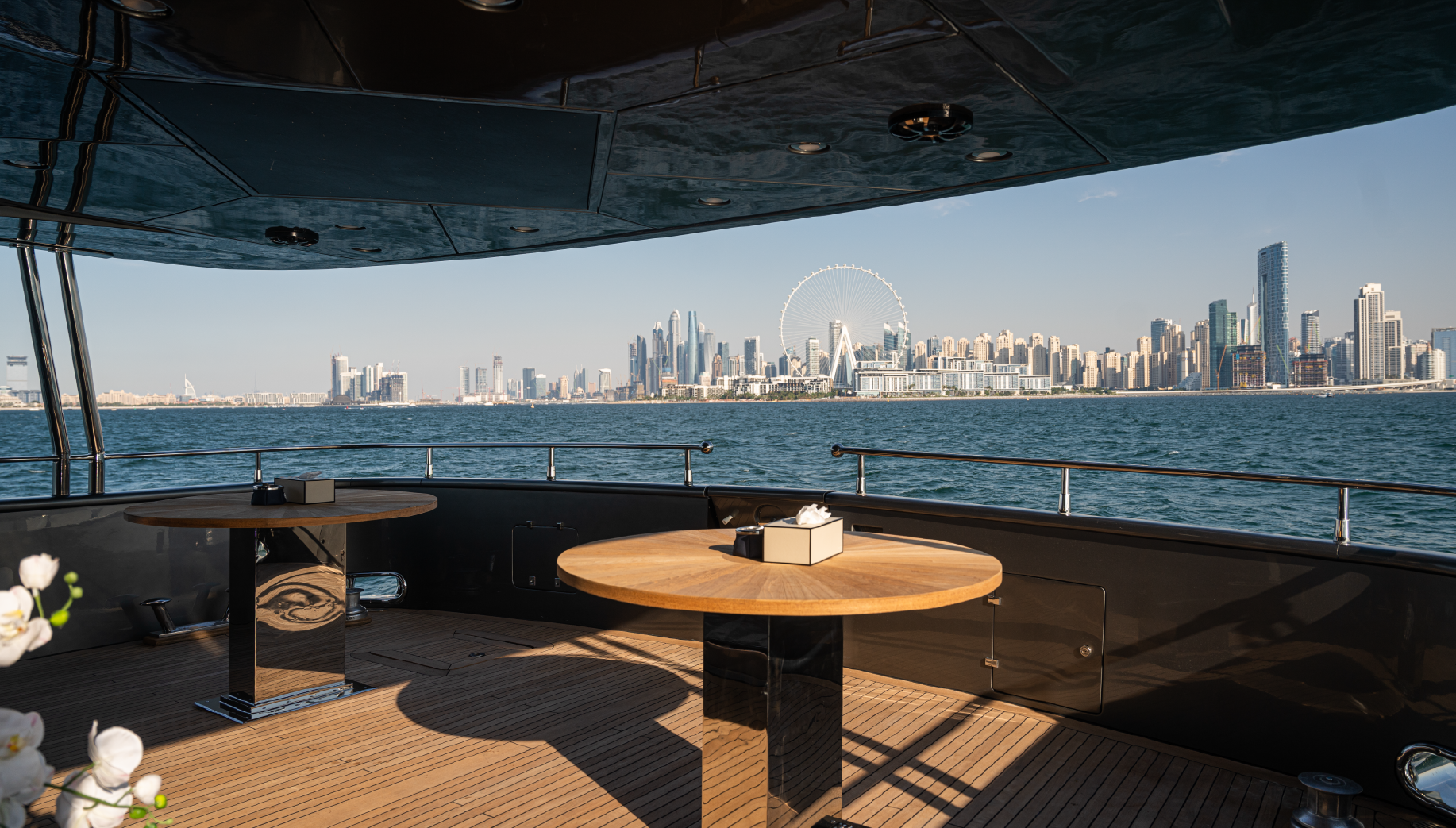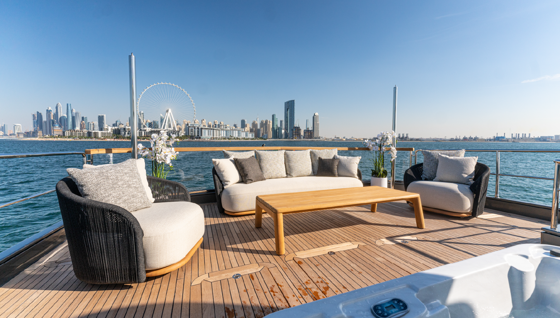 Cruising with powerful, overhauled engines and advanced navigation technology, Spectre delivers a smooth, safe journey. The expansive outdoor decks, complete with elegant lounging and dining areas, are perfect for enjoying the sunshine or the stunning Dubai skyline. This yacht blends luxury, comfort, and performance to create an exceptional charter experience.