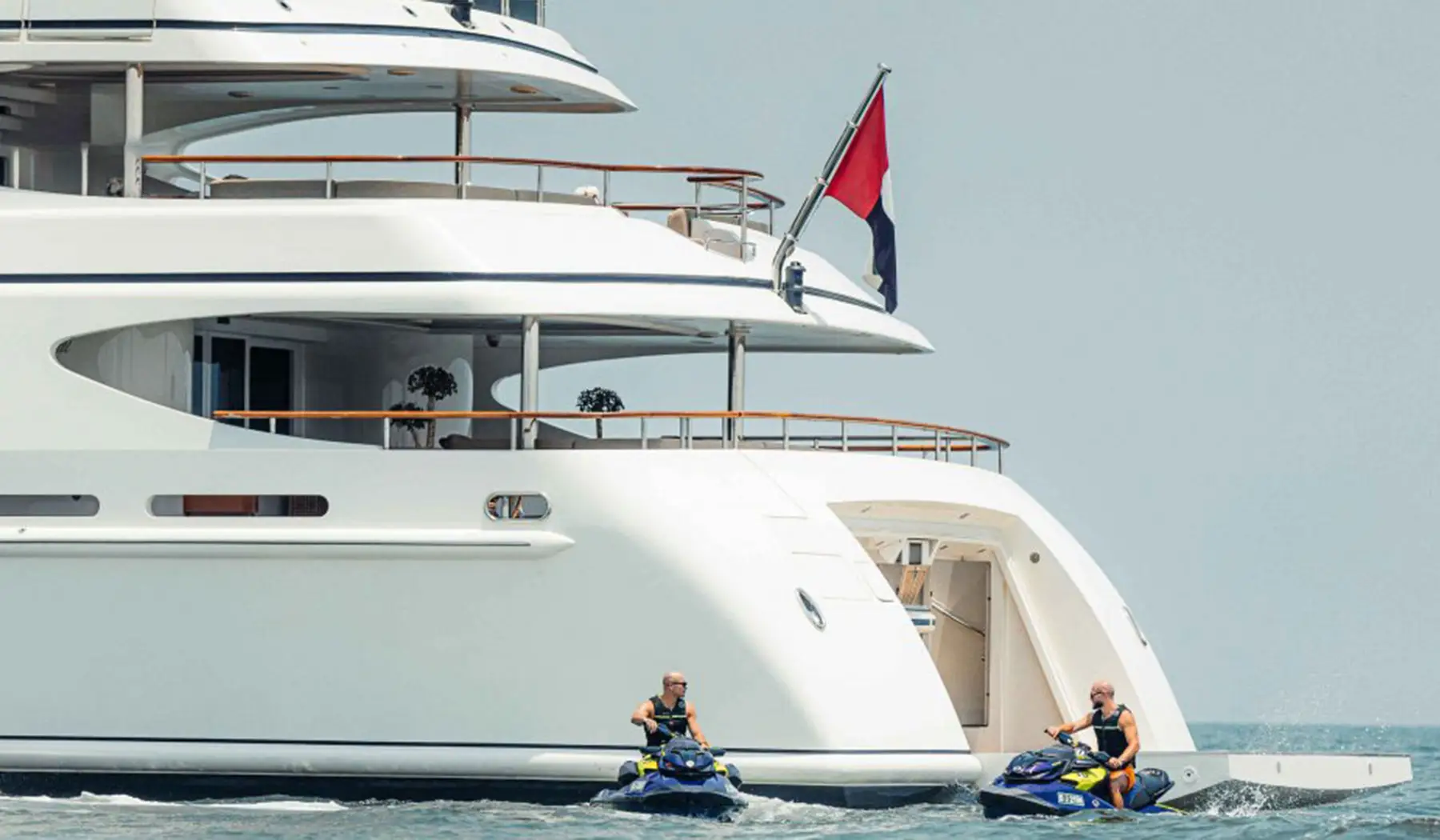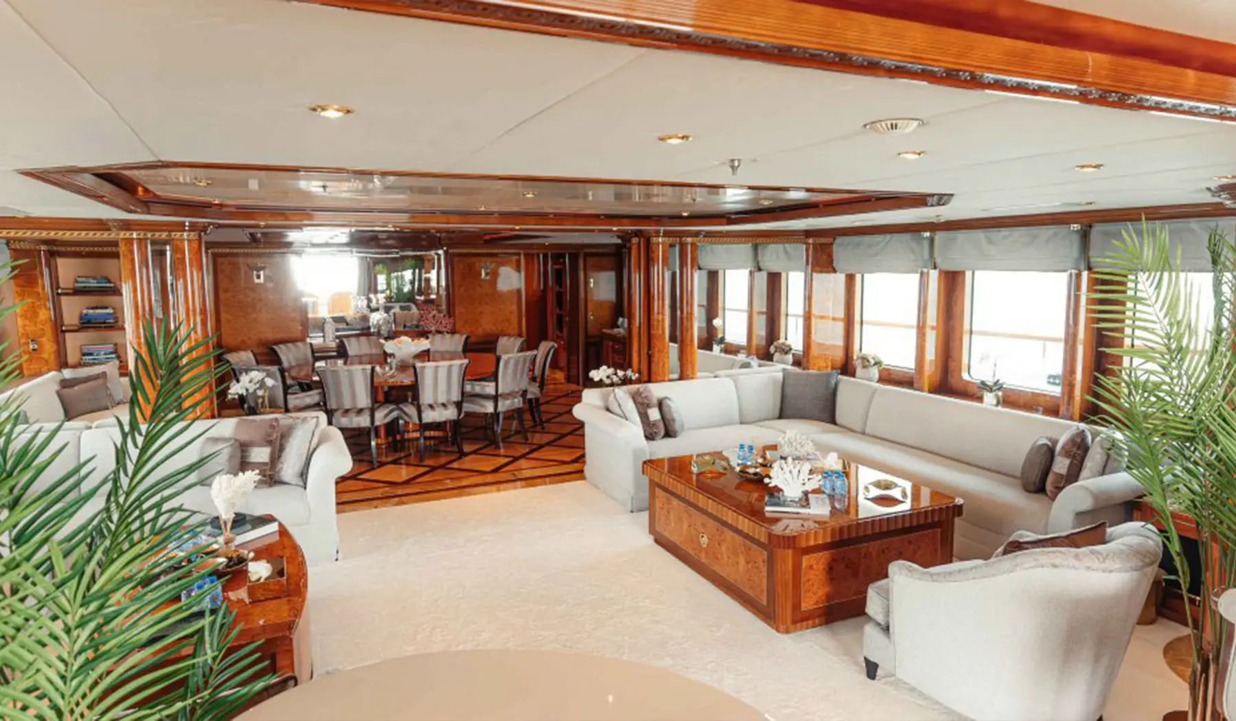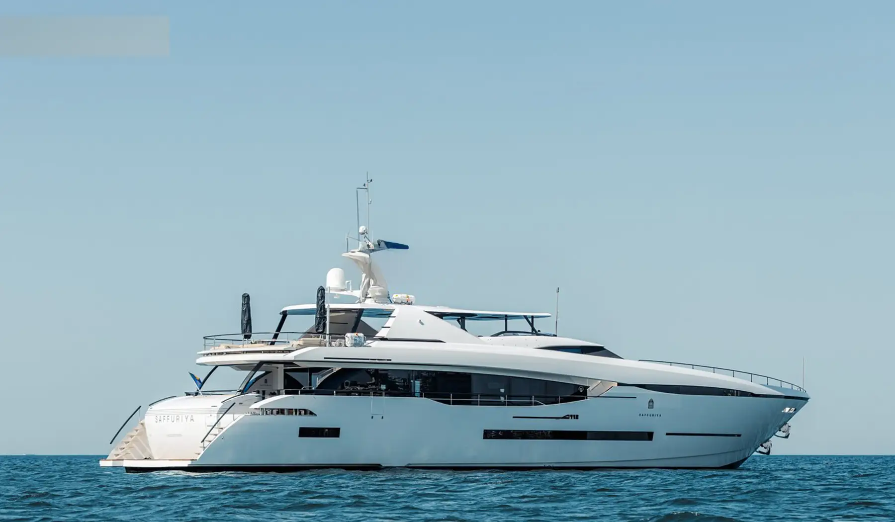 The yacht’s exterior exudes sophistication, with sleek, flowing lines and expansive outdoor areas spanning three luxurious decks. The sundeck features a Jacuzzi, a fully stocked bar, and ample lounging space, perfect for unwinding under the Arabian sun while soaking in panoramic views of Dubai’s skyline. Inside, the open-plan salon and dining area showcase meticulous craftsmanship, floor-to-ceiling windows, and elegant furnishings that blend seamlessly with breathtaking ocean views.