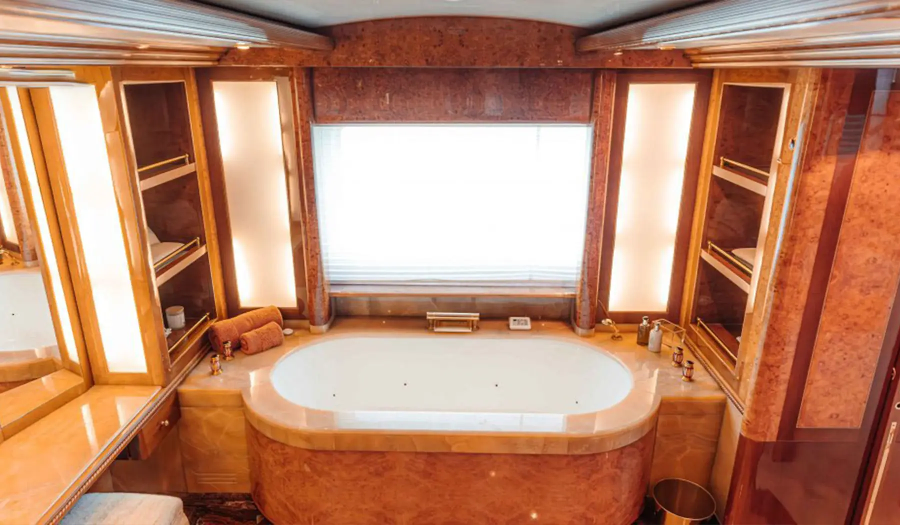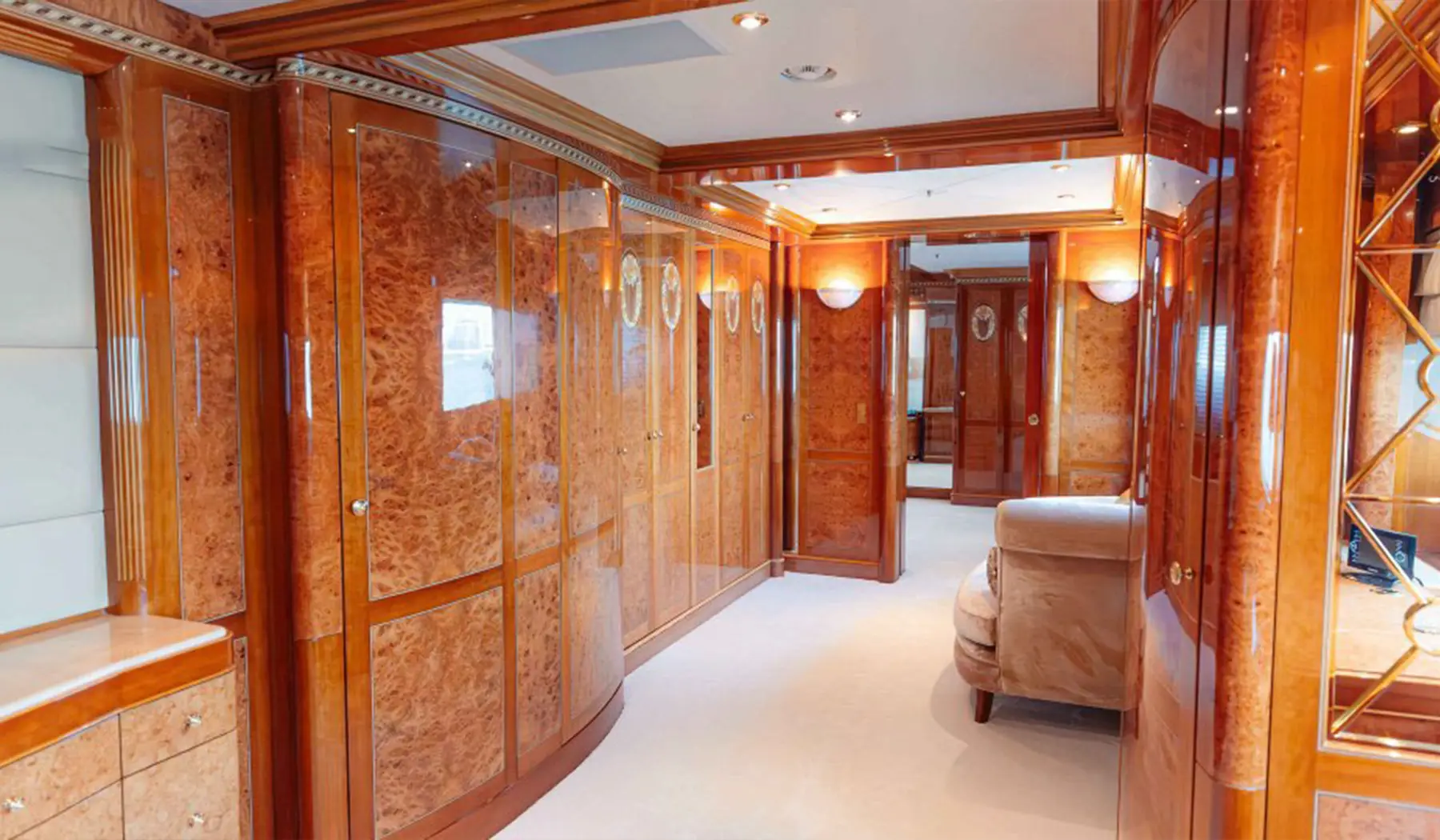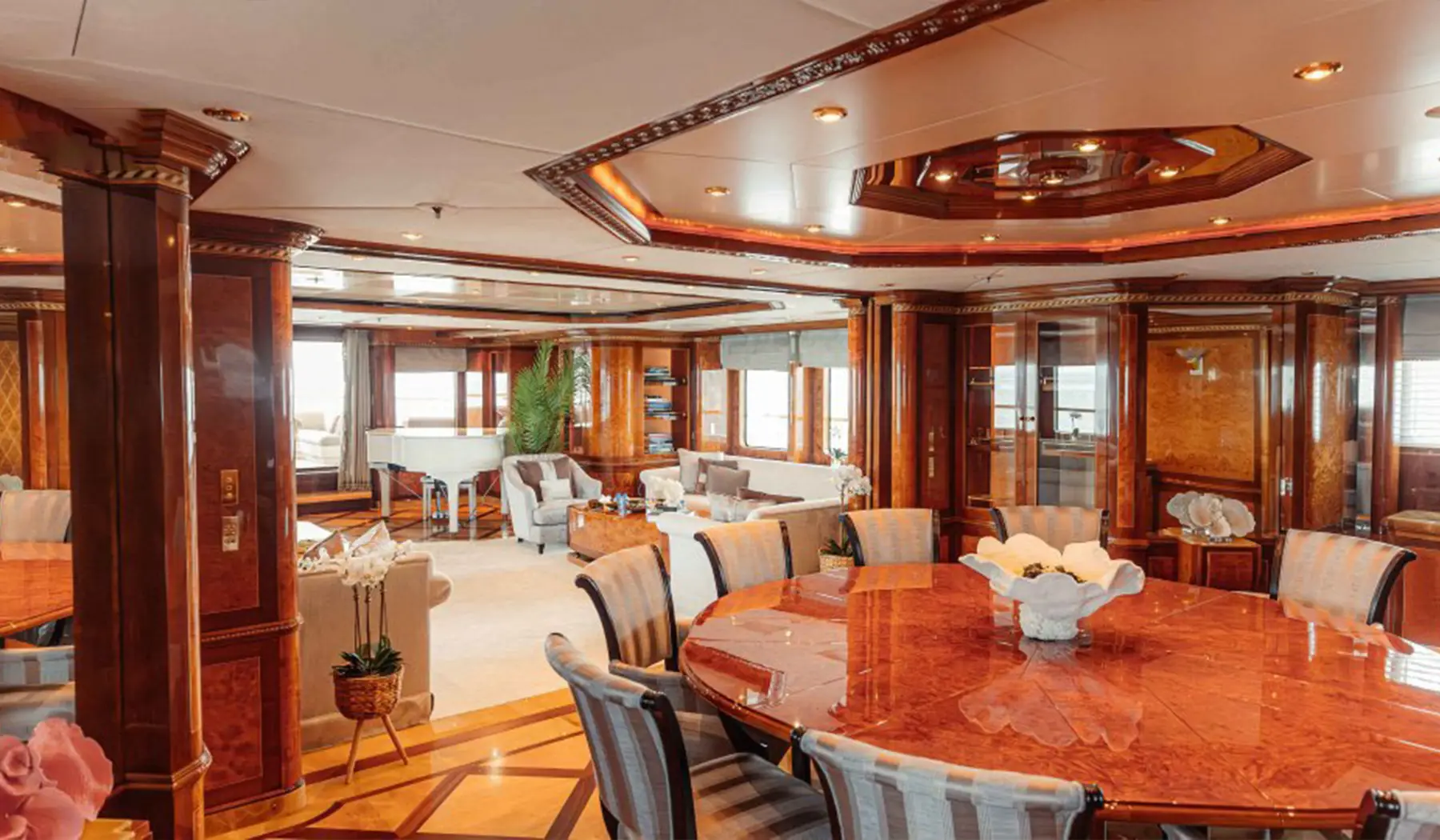The yacht’s exterior exudes sophistication, with sleek, flowing lines and expansive outdoor areas spanning three luxurious decks. The sundeck features a Jacuzzi, a fully stocked bar, and ample lounging space, perfect for unwinding under the Arabian sun while soaking in panoramic views of Dubai’s skyline. Inside, the open-plan salon and dining area showcase meticulous craftsmanship, floor-to-ceiling windows, and elegant furnishings that blend seamlessly with breathtaking ocean views.