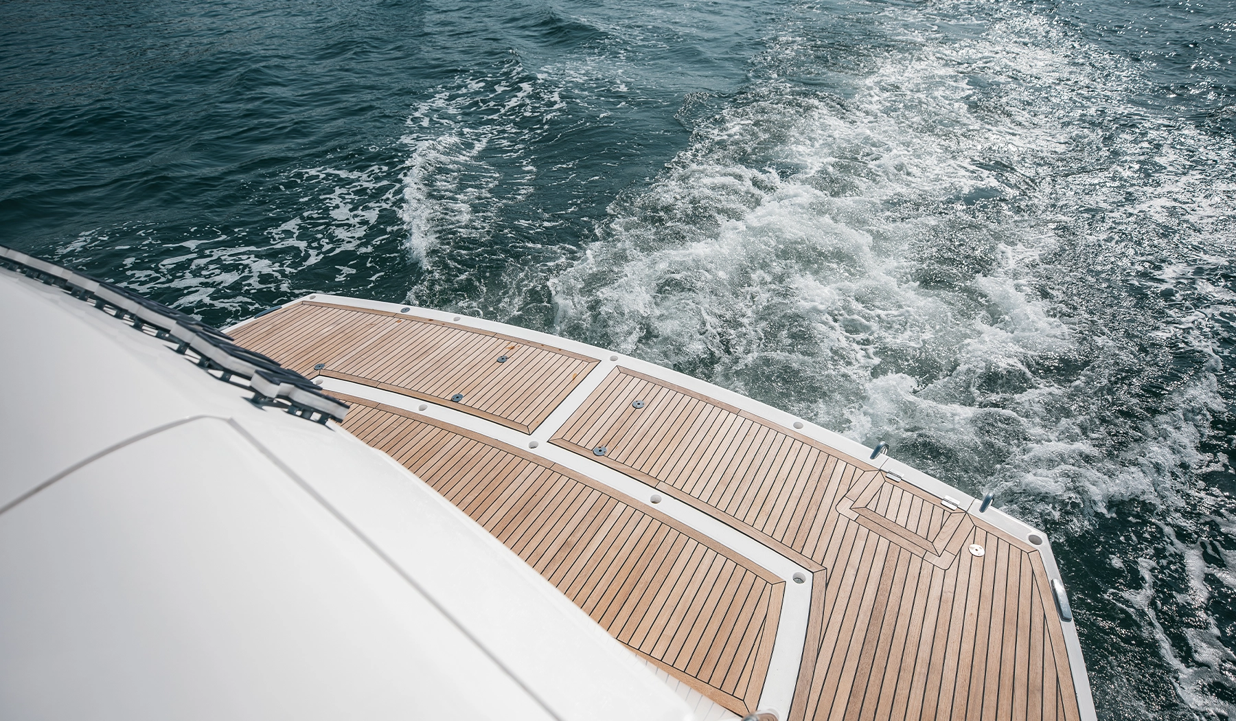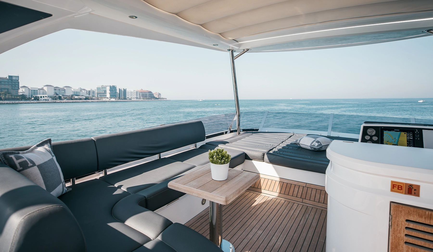 • Spacious flybridge, sun pad, lounge, and dining areas.