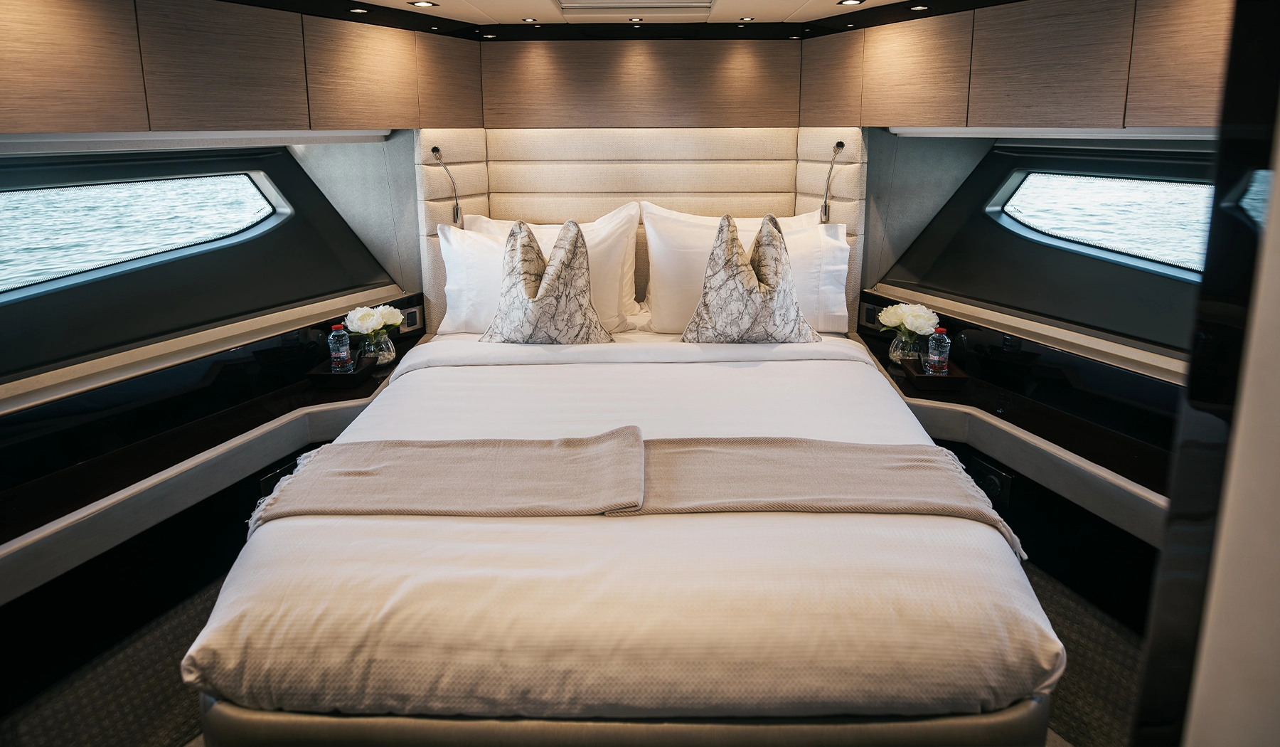 With spacious decks, a flybridge for panoramic views, and elegant outdoor dining areas, the yacht is made for relaxing and socializing. Inside, the air-conditioned cabins and stylish lounge provide a cool, inviting space to unwind. Accommodating up to 20 guests for day trips, the yacht ensures a seamless experience, from its fully equipped galley to ensuite bathrooms in every cabin.