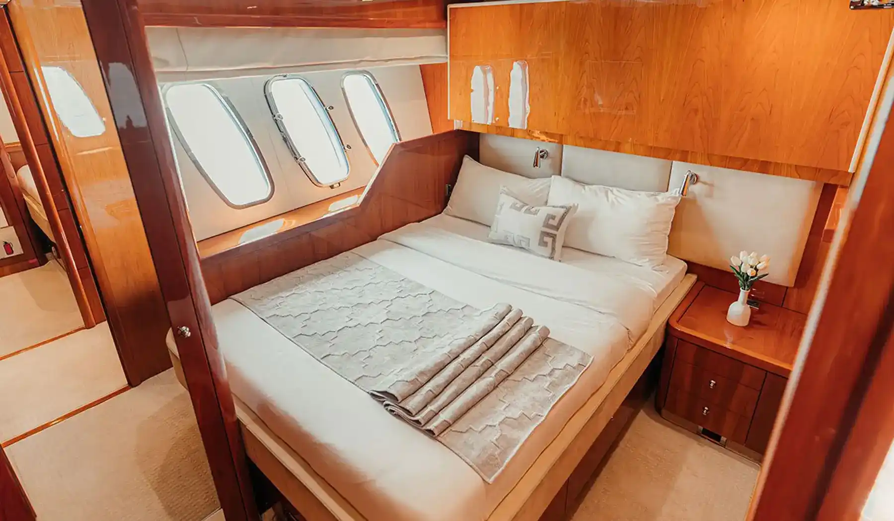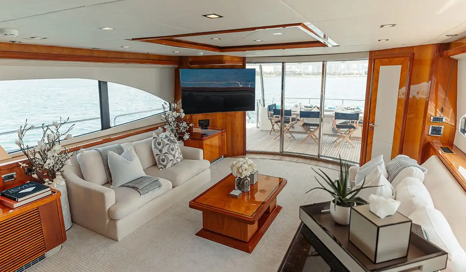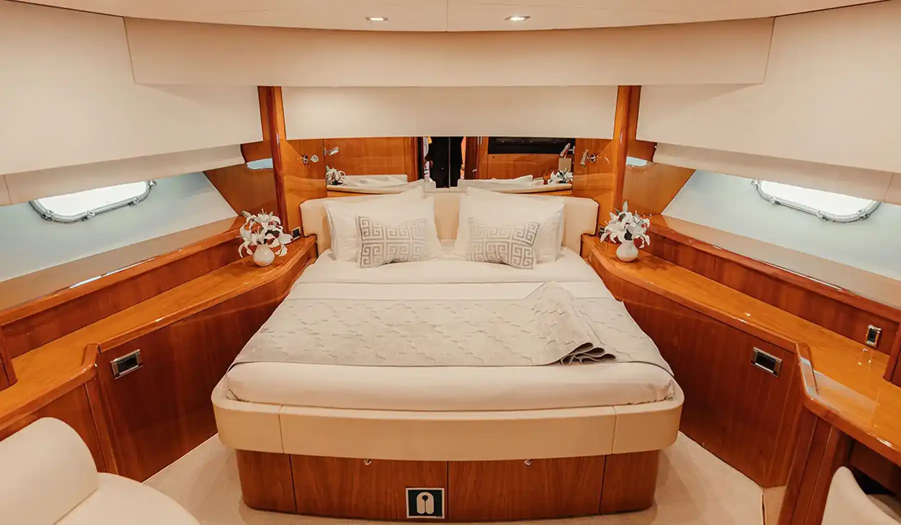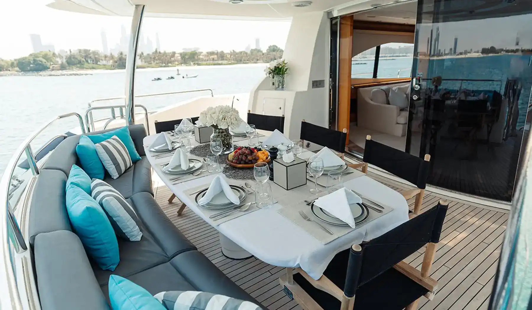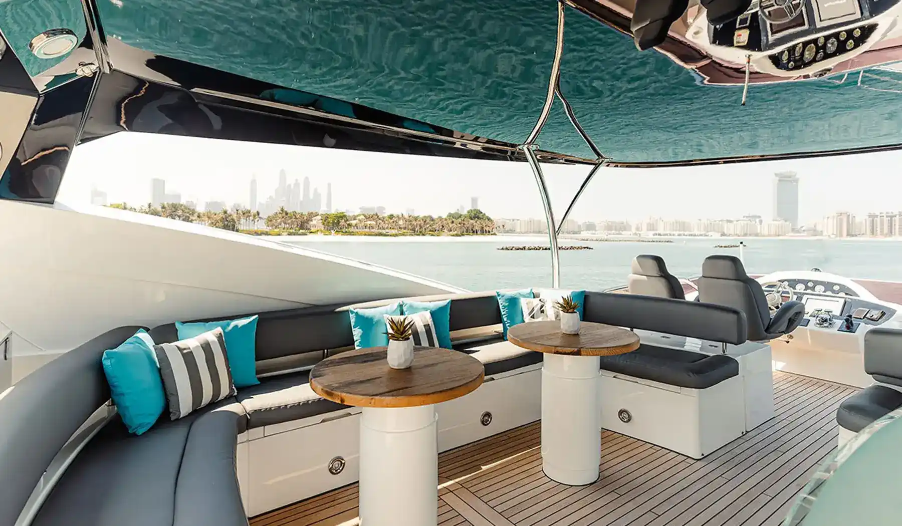 Inside, Notorious offers expansive living spaces, including a stylish main salon, a fully equipped kitchen, and four luxurious cabins accommodating up to 8 overnight guests. The master suite and VIP cabin provide a haven of relaxation, while the double cabins ensure everyone onboard enjoys privacy and comfort. The yacht’s elegant interior is complemented by cutting-edge entertainment systems and advanced air conditioning to keep you cool even in Dubai’s heat.